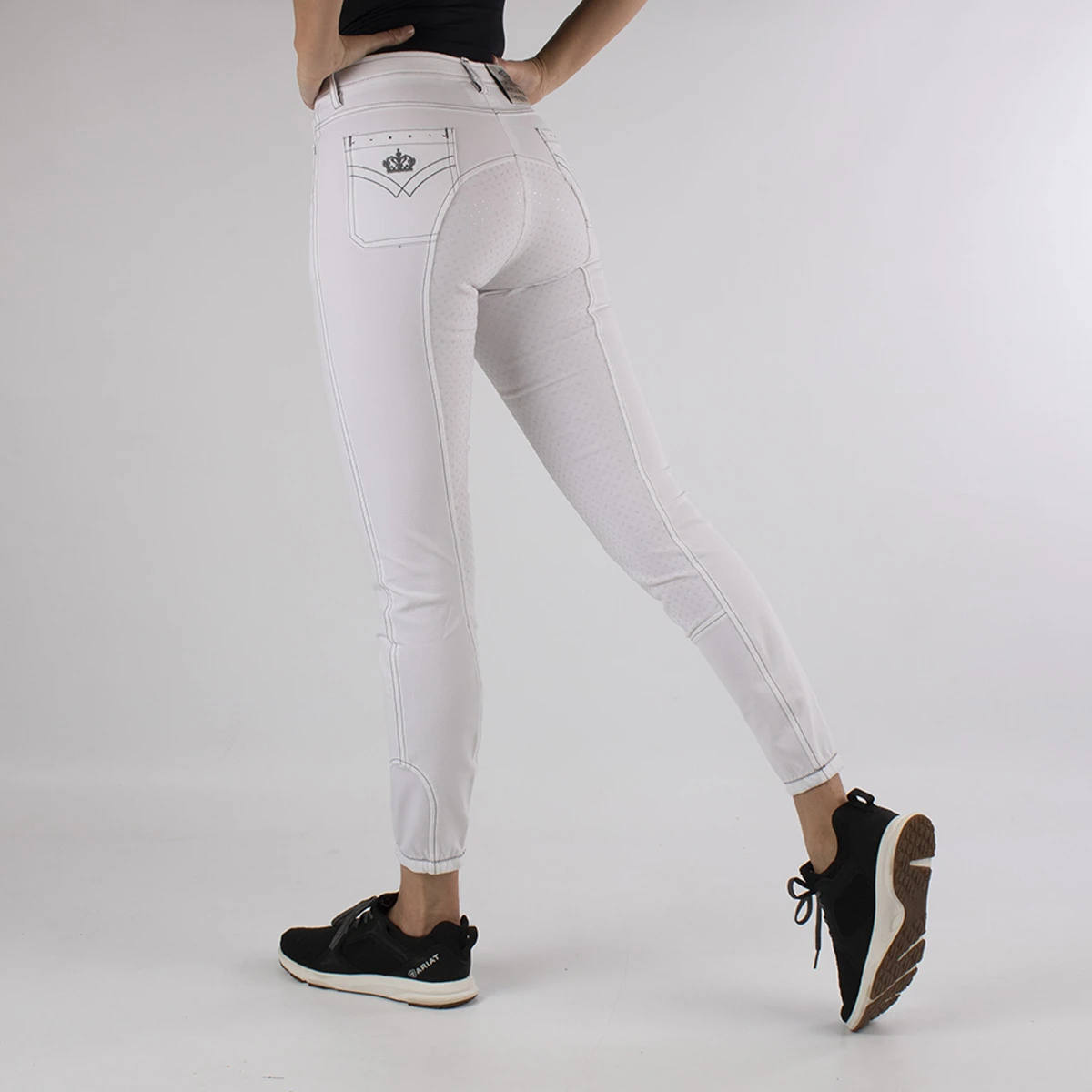 - afgewerkt met strass steentjes en kroontje op de achterzak